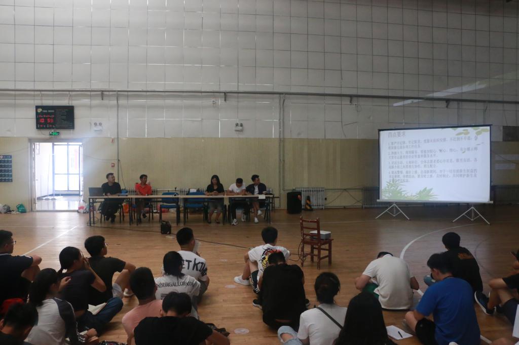 学院团委于8月23日在学院新球馆召开2019年迎新志愿者培训会。学院党委副书记展利民、团委书记梁贺涵及团委学生会各部门学生代表共110余名青年志愿者参加了此次培训会。会议由团委书记梁贺涵主持。