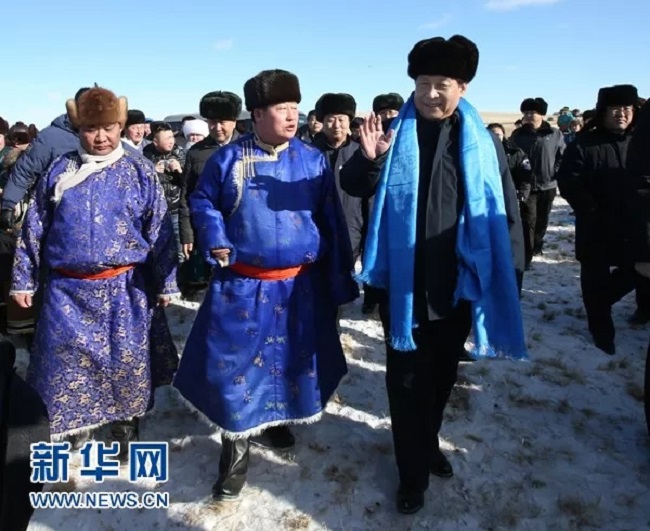 △在锡林浩特市宝力根苏木(乡)冬季那达慕上,习近平向牧民们挥手问候。