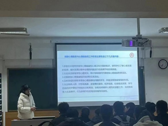 本次培训主要内容主要是以班级心理委员与宿舍心理信息员的职责、大学生常见心理问题的识别、大学生常见心理问题的应对、班级心理委员与宿舍心理信息员自我调节与成长四个方面进行讲述,引导班级心理委员与宿舍心理信息员能够及时发现并有效的预防同学的心理问题,并通过合适的方法进行调节解决问题,共同营造积极向上的班级氛围和校园环境。