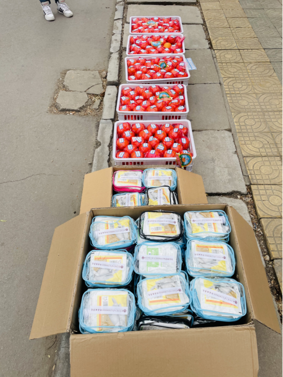 “暖心礼包”里既有实用的防疫物资——N95口罩、酒精免洗手消毒凝胶、一次性医用防护手套,也有祝福考研学子“脐”开得胜、“橙”功上岸的甜蜜脐橙。