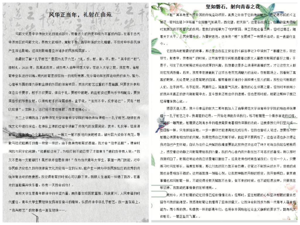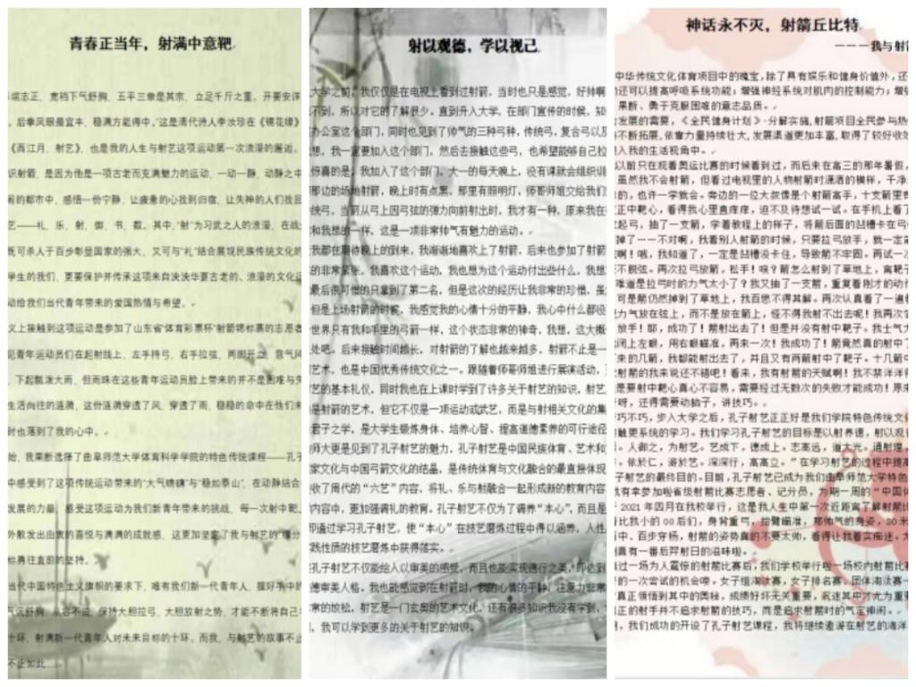 孔子射艺发展办公室举办,采用线上投稿的方式举行,面向全院学生征集作品。此次活动,同学们通过讲述故事的形式表达对射艺的了解,或追忆曾经的训练时光,或描述射箭时的英姿飒爽,或表达心中的一腔热血;每一份故事中都饱含着同学们真挚的情感与无限的慨叹。经相关评委筛选评比,最终魏祥哲荣获一等奖;于文豪、孙昌荣荣获二等奖;张萃珊、曹依凡、朱瑞琪荣获三等奖。