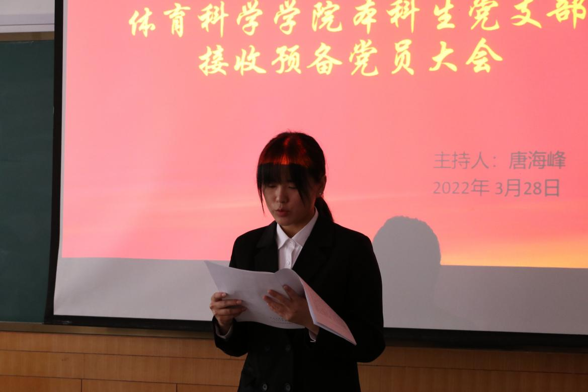 本科生党支部于系楼110教室召开预备党员接收大会,本次会议由党支部书记唐海峰主持,党委副书记马振华指导,本科生党支部全体党员参加。