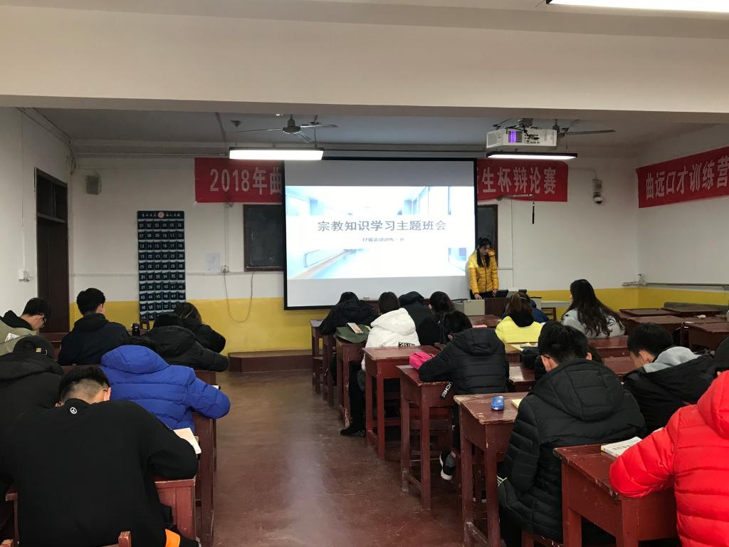 于2018年12月3日晚开展“宗教知识学习”主题班会,班会由各班团支书组织并进行。