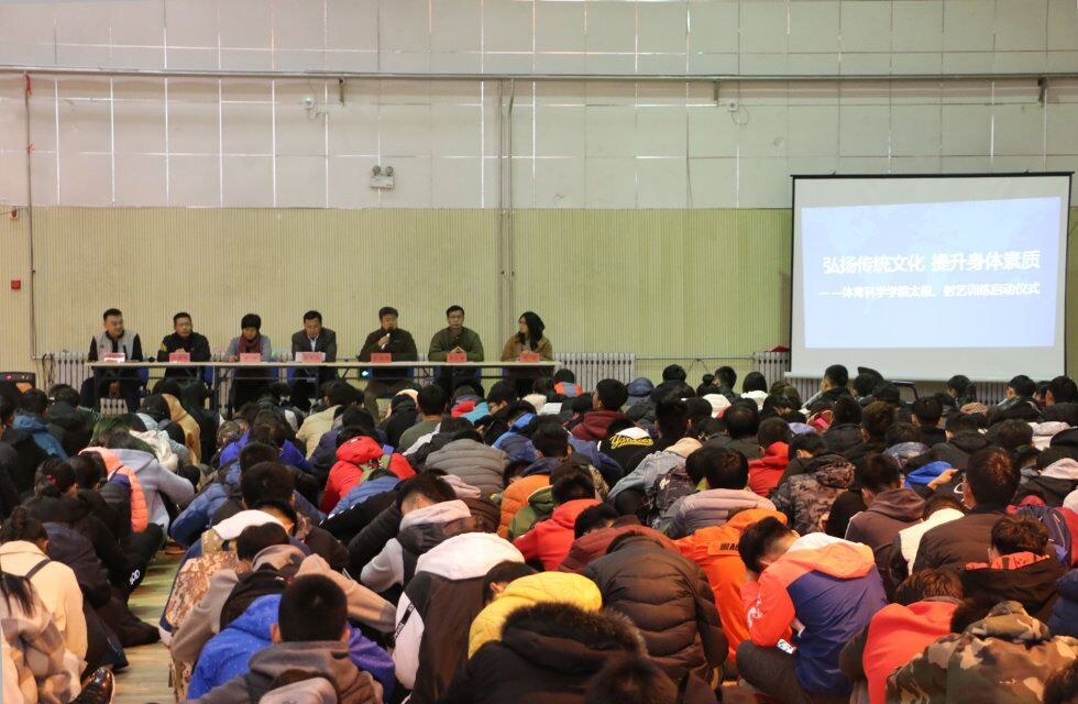 太极文化和射艺文化,塑造品牌特色,打造一支健康、活力的青年学生队伍,11月6日下午,学院在新球馆举行太极、射艺训练启动仪式。学院党委副书记展利民、学院副院长李思民、学院办公室主任王丽、团委副书记梁贺涵、武术教研室主任刘建国、2017级辅导员李士建、2018级辅导员刘京,全体武术教研室老师出席了此次活动。活动由梁贺涵主持。