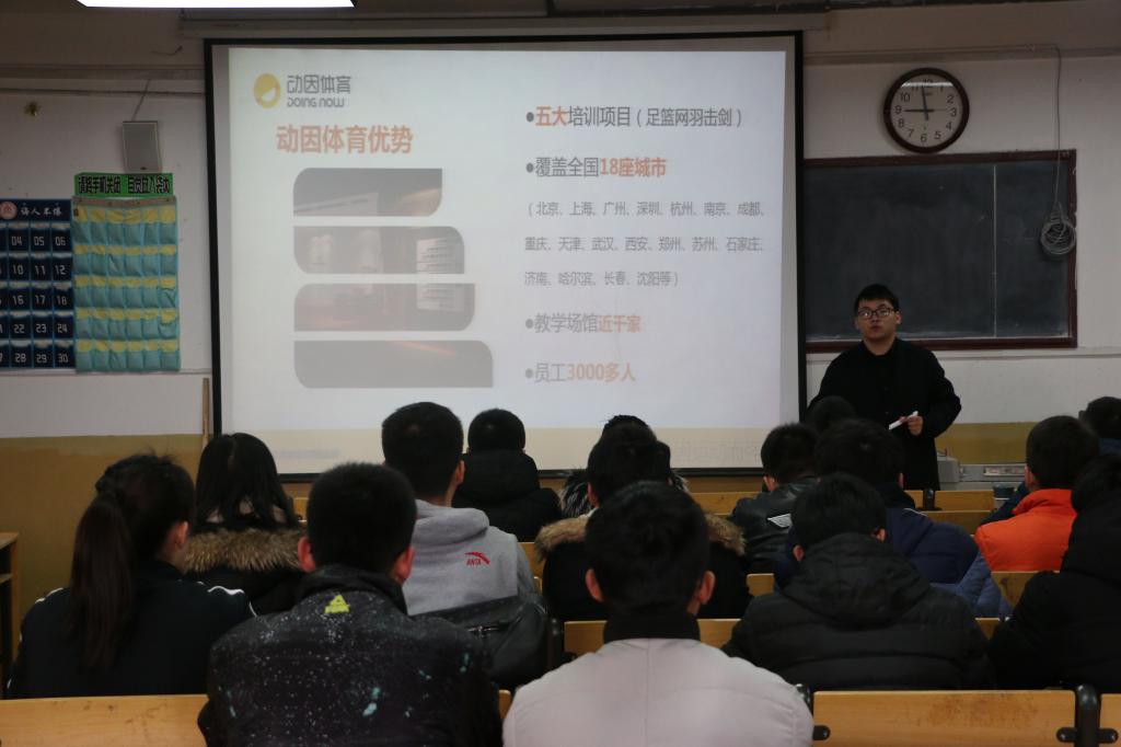 一开始高昌久老师对动因体育公司的发展历程做了简单介绍。紧接着对动因体育的优势、企业福利、所获奖项、职业发展路线等进行了具体介绍。动因体育公司成员大多数是九零后,成员们年轻有活力,对工作态度端正,短短的几年时间就把动因体育打造成市值100亿的行业内最大企业。刚结束研究生考试的应届毕业生丝毫不受考试压力的影响,积极主动的和高昌久老师进行互动问答,对公司的薪资待遇、就业城市选择、自身体育专业与应聘单位等问题进行询问。