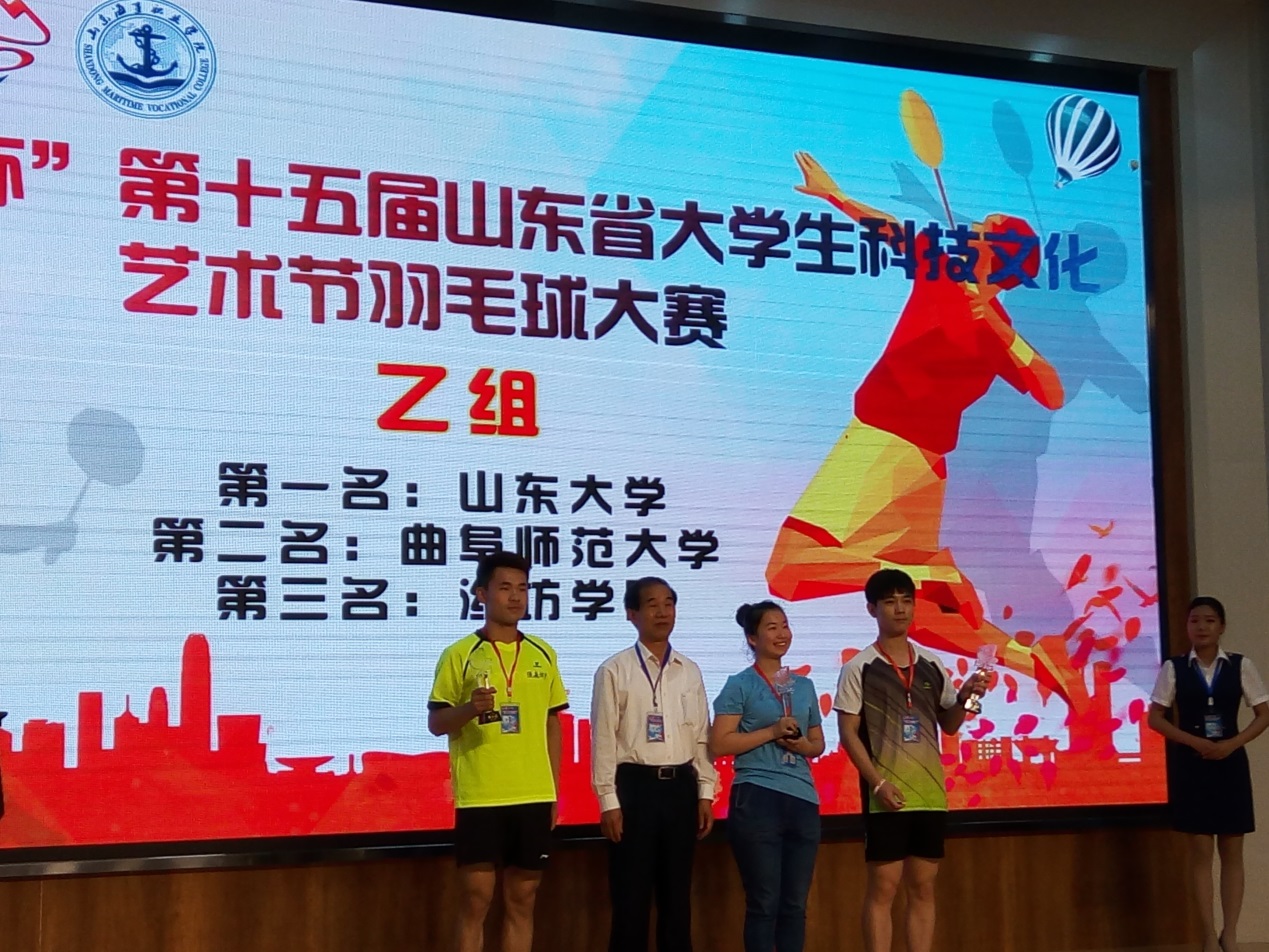 2017年6月10日至12日,“山海院杯”第十五届山东省大学生科技文化艺术节羽毛球大赛在山东海事职业学院拉开帷幕,此次比赛包括山东大学、中国海洋大学、山东科技大学等16所高校参加,我院也派出队伍参加比赛,经过三天激烈的角逐,国产视频 代表队荣获乙组团体亚军的好成绩,廖志强老师获得优秀教练员称号。