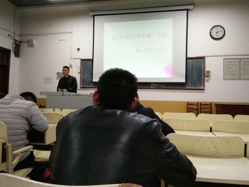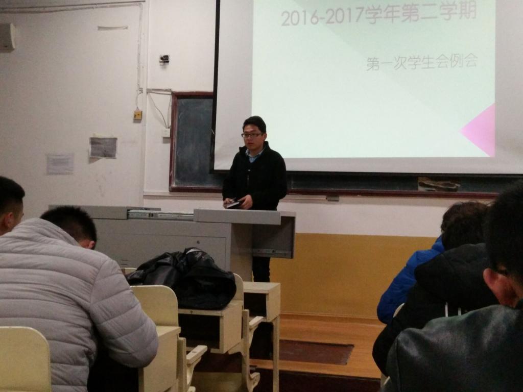 2016—2017学年第二学期第一次学生会例会在院楼209教室召开。参加本次例会的主要成员有学院团委副书记张庆义,主席团成员和学生会各部部长。本次例会由学生会主席尚佳主持。