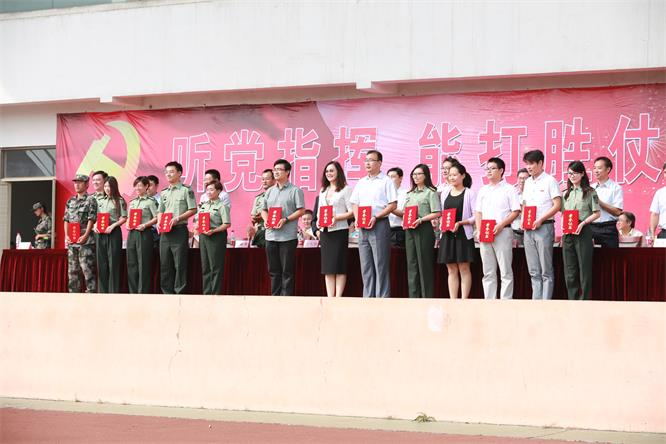 2016年学生军训成果汇报表演暨表彰大会在南操场举行。我校党委书记荆兆勋,副校长张洪海,山东陆军预备役炮兵师侦察科科长杨云国,党委办公室、教务处、保卫处、团委等部门的负责同志出席大会。