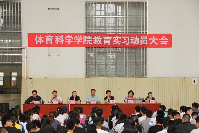 于学院篮球馆召开2012级本科生教育实习动员大会,出席大会的有学院党总支书记荆兆清、院长曹莉、副院长刘洪珍、党总支副书记展利民、办公室主任王丽、团总支书记赵峰、教务员滕云玲,本次动员大会由赵峰老师主持。