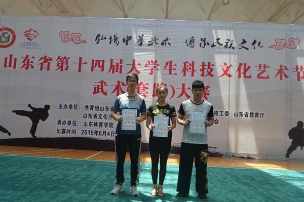 刘建国老师的指导下取得了可喜成绩,陈方旭、候振兴、王炜分别获女子太极拳第二名、男子棍术第二名、男子太极拳第七名好成绩。