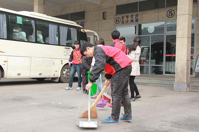 其后,志愿者绶带斜带在肩上,排着整齐的队伍步行来到曲阜汽车站。经与汽车站负责人沟通协调,志愿者中的女同学负责汽车站外围路面卫生,而男生负责汽车站内卫生。经过紧张忙碌,车站内外环境焕然一新,车站负责人给予了同学们高度评价,对同学们的表现表示赞许。