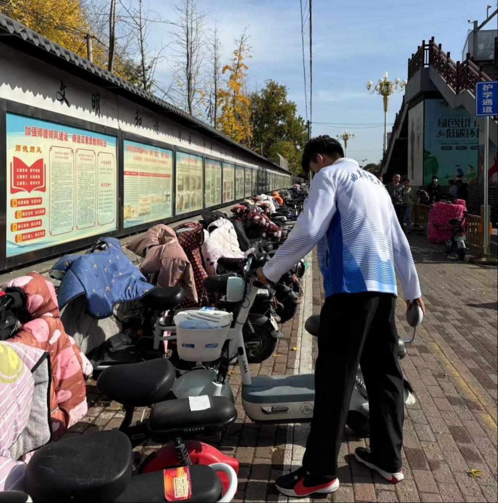 在服务过程中,志愿者们将校园道路两旁随意停放的电动车推到指定停放点,做到路面整洁,无乱停乱放。按照箭头所指方向摆放整齐。经过志愿者们的努力,电动车摆放得井然有序,校园周边环境更加干净整洁。为市民的出行和学生的上下学提供了更加便利的条件。