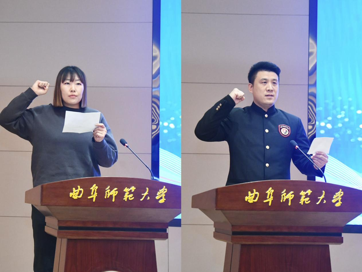 武术教研室主任、山东省第五届高校体育教师基本功大赛武术项目总裁判长樊腾飞代表全体裁判员宣誓。