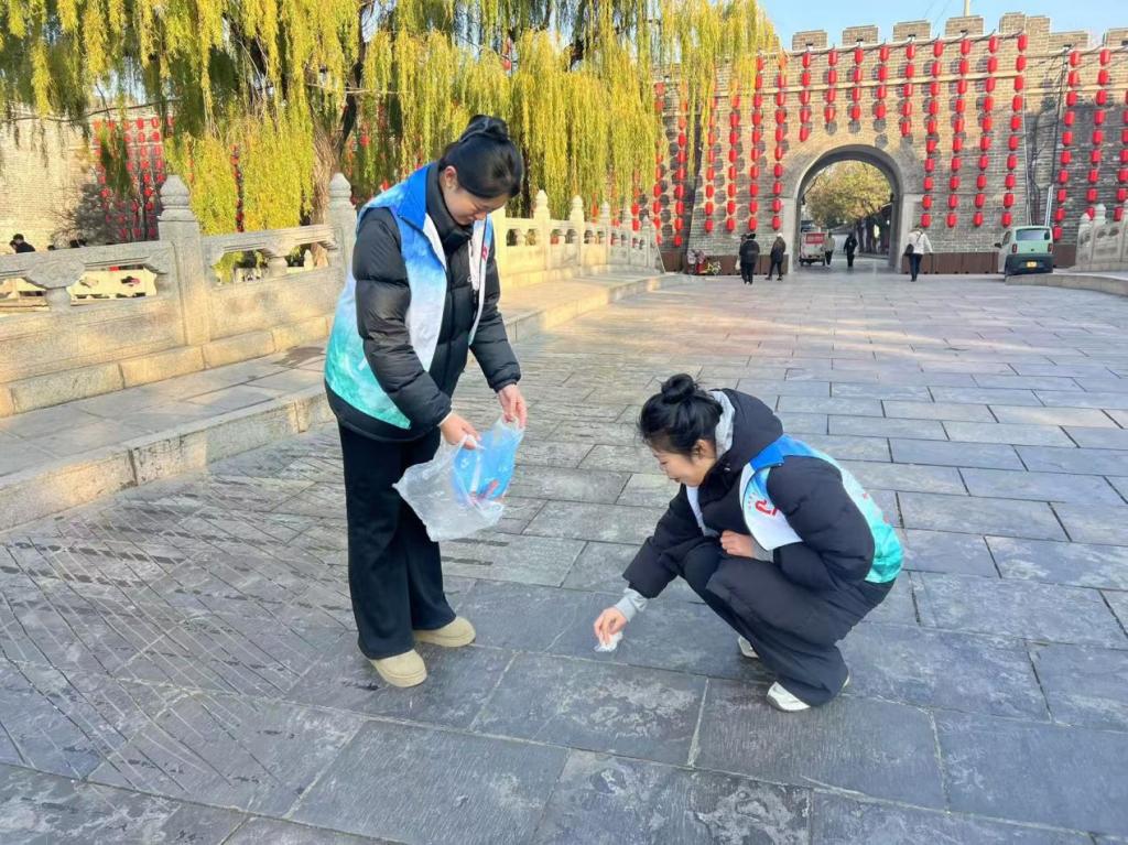 活动当日清晨 7:50,志愿者准时齐聚三孔景区万仞宫墙前,虽寒意未消,但大家热情满满。简短培训与分工后,大家手持清洁工具,奔赴各自负责区域,开启垃圾清理工作,干劲十足,不放过任何角落。
