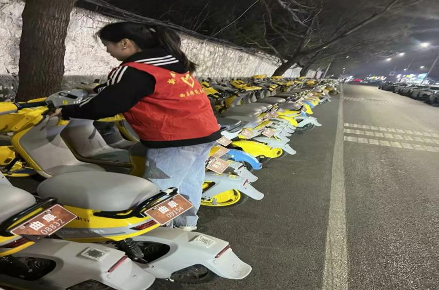 夜幕降临,志愿者们仍未停下脚步,来到共享单车停放区域,将随意停放的车辆一一扶正,并按照规定整齐排列,让城市的街道更加整洁有序。