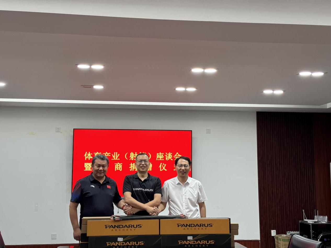 举行射箭器具捐赠仪式。潘神品牌、宁波沐森户外用品有限公司总经理朱向勇,宁波尚盛体育用品有限公司业务经理秦华亮,AKUSTA阿酷斯塔品牌、青岛宇日体育用品有限公司销售经理荣海伦,鑫盾体育业务经理李腾飞,国产视频