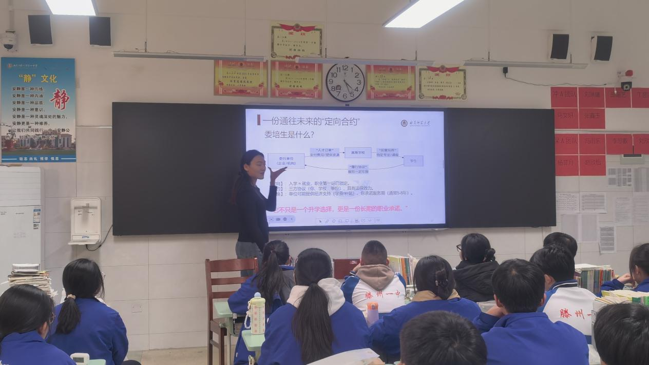 “星火燎原”实践队回到母校滕州市第一中学,开展了一场以“提前批公费师范生和委托培养生”为主题的宣讲活动。作为山东省重点中学,滕州一中学子历年本科升学率居高不下,每年都有大量学生考入理想大学。面对这样一群成绩优异的学弟学妹,实践队队员们带来了另一种发展思路——通过提前批公费师范生实现“上学免学费、毕业有编岗”的优质选择,为高考报考增添新的可能。