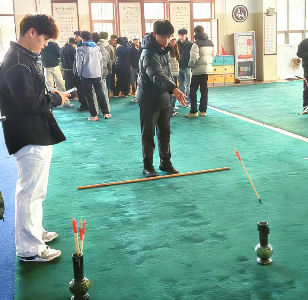 两米开外,铜壶静立,赛场光影雅致。志愿者耐心讲解投壶礼仪与技巧,手把手指导同学们站姿与握箭角度。选手凝神专注,动作利落干脆,竹箭或精准入壶,或擦边而过,每一次投掷都尽显沉稳与巧思。赛场动静相宜,屏息与喝彩交织,尽显传统雅艺之趣与精准之美。