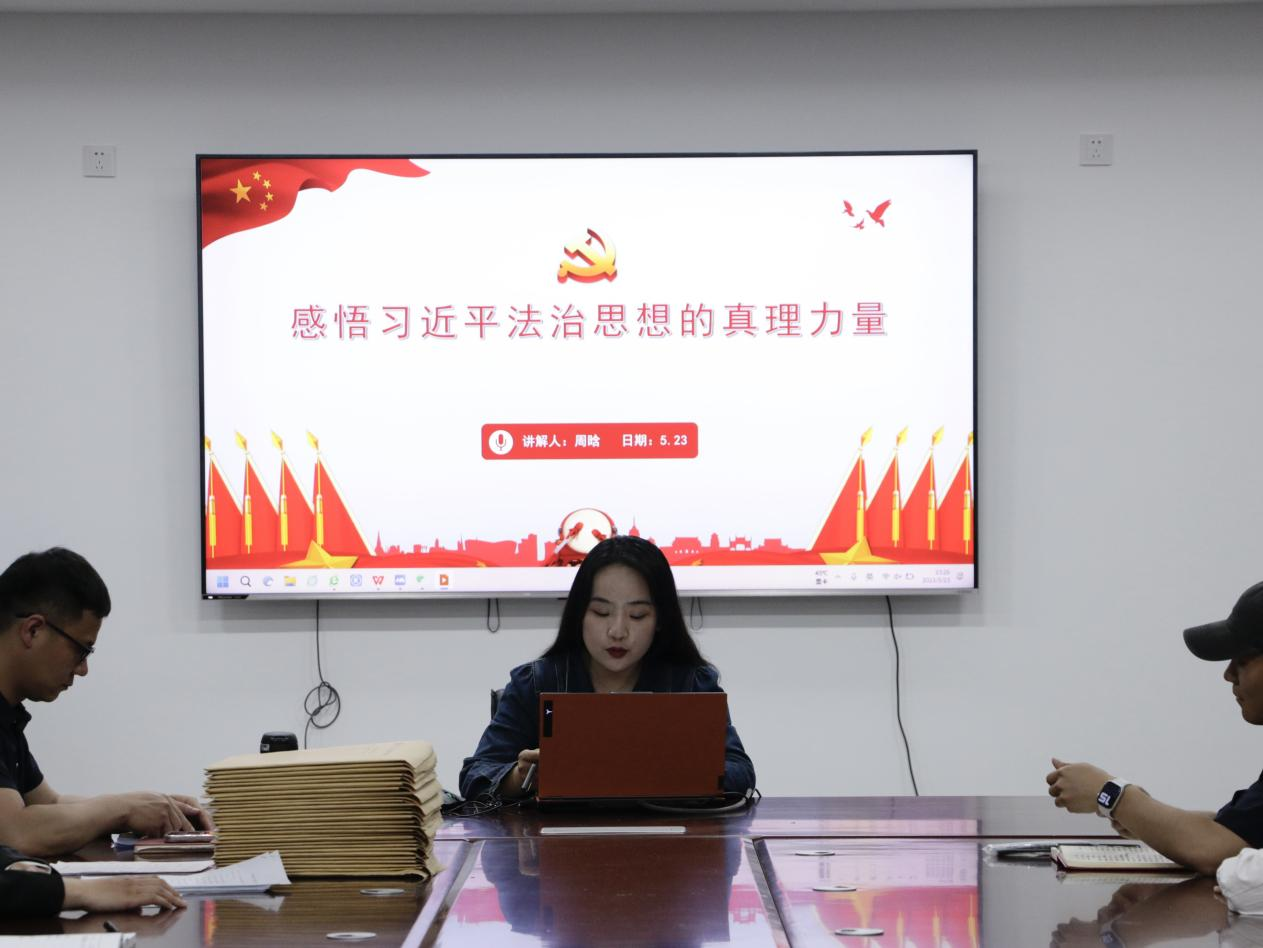 习近平法治思想是习近平新时代中国特色社会主义思想的重要组成部分,在会议上,周晗同志从习近平法治思想顺应中华民族伟大复兴的时代要求、习近平法治思想具有鲜明的政治导向、习近平法治思想坚持以人民为中心、习近平法治思想闪耀着马克思主义理论光辉、习近平法治思想吸收借鉴中华优秀传统文化和世界法治文明这五个方面向全体党员阐述了习近平法治思想的真理力量。