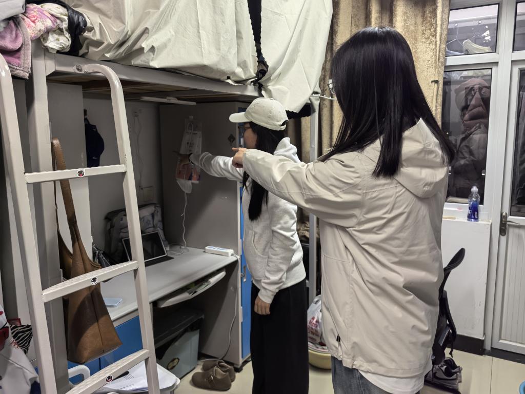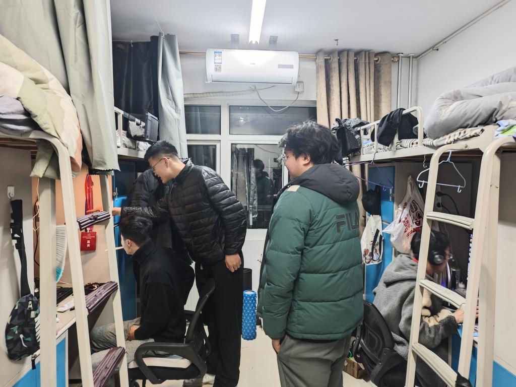 辅导员郗来军带领学生党员干部与宿管部成员分组检查了宿舍安全和卫生。在检查过程中,大家仔细查看床铺是否整齐、物品摆放是否合理以及用电是否安全等情况,指导学生对个人物品进行分类整理,督促学生完成宿舍卫生死角的清理,鼓励他们积极参与到宿舍文化建设中来。针对发现的问题,及时进行了反馈,并给出了相应的解决方案。